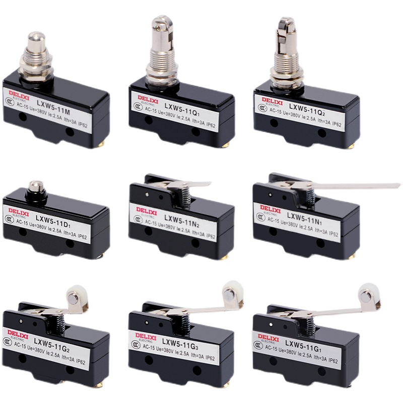 4、一般以無輔助按壓附件為基本型式,并且派生出小行程式、大行程式。根據(jù)需要可加入不同輔助按壓輔件,根據(jù)加入的不同的按壓輔件開關(guān)可分為按鈕式、簧片滾輪式、杠桿滾輪式、短動(dòng)臂式、長(zhǎng)動(dòng)臂式等各種形式。